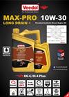 Veedol Max-Pro Long Drain Plus 10W-30 น้ำมันสังเคราะห์เกรดพรีเมี่ยม เหมาะสำหรับรถยนต์ดีเซลคอมมอนเรลรุ่นใหม่สมรรถนะสูง รถที่ติดตั้งEGRวาล์ว และระบบกำจัดไอเสีย DPF ที่ต้องการน้ำมันคุณภาพสูงช่วยปกป้องเครื่องยนต์ ลดการสึกหรอ หล่อลื่นได้ดีเยี่ยมช่วยประหยัดน้ำมันเชื้อเพลิง